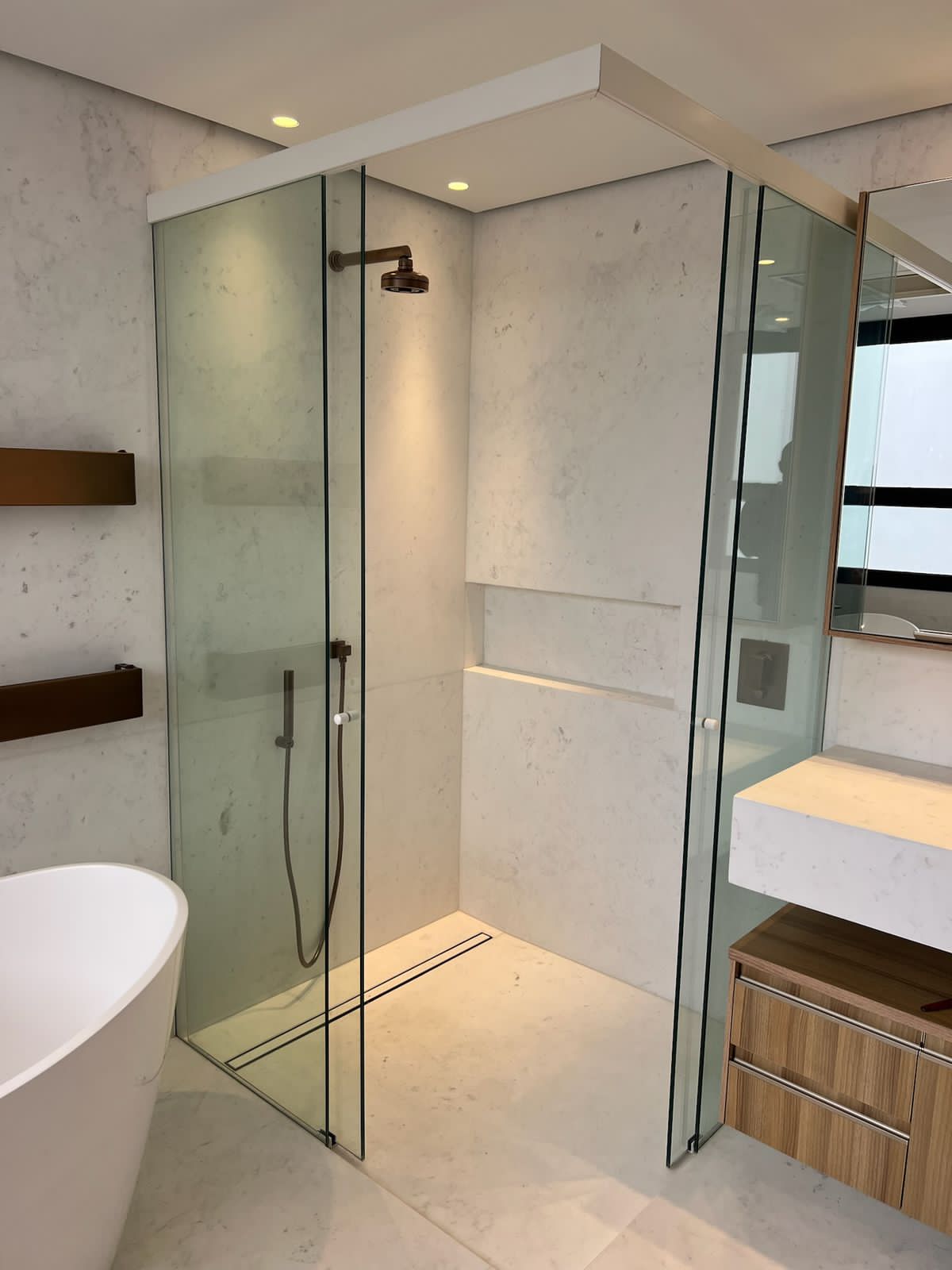Temos box em vidro temperado para banheiro em diversos modelos e sob medida. Um encaixa perfeitamente ao design do banheiro.