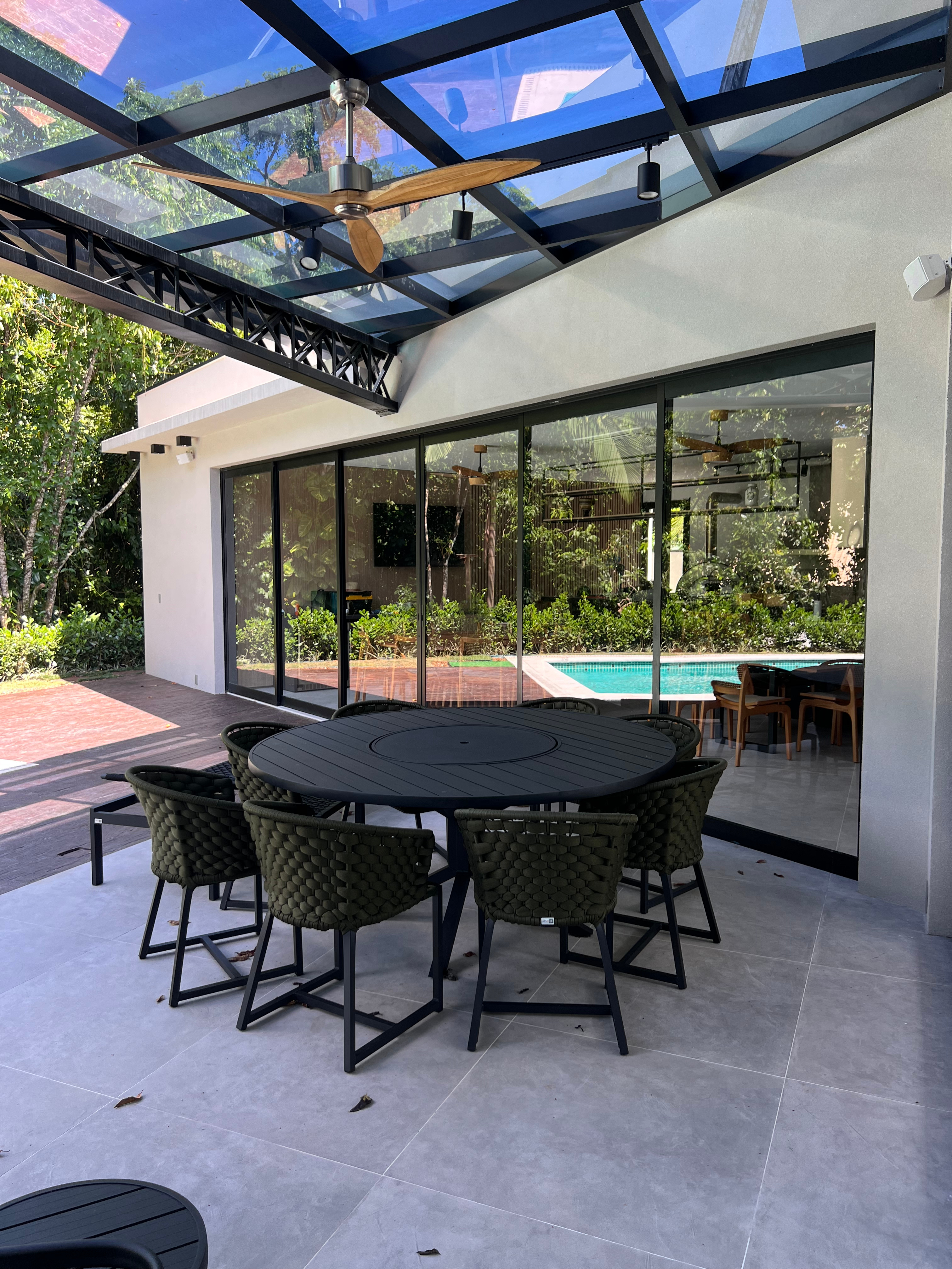 A cobertura de vidro não só torna o ambiente mais aconchegante, mas também protege tanto as pessoas quanto os móveis contra as intempéries.