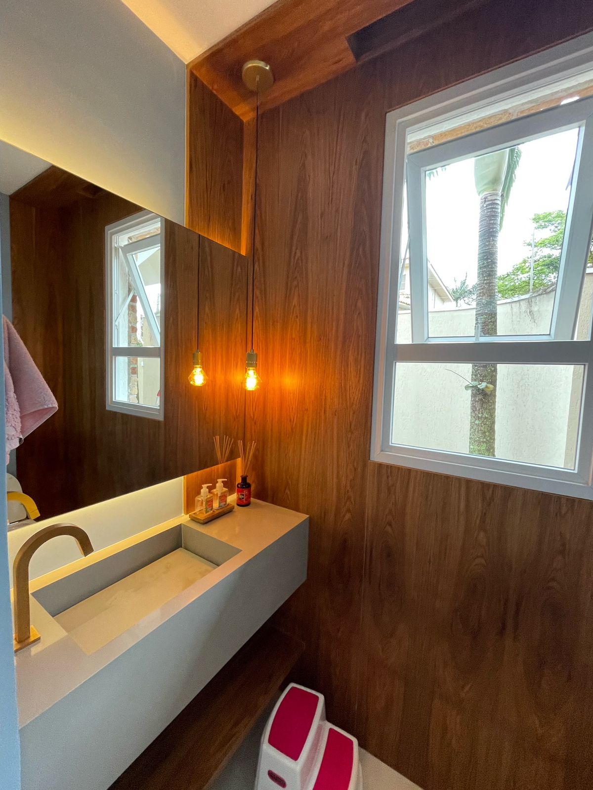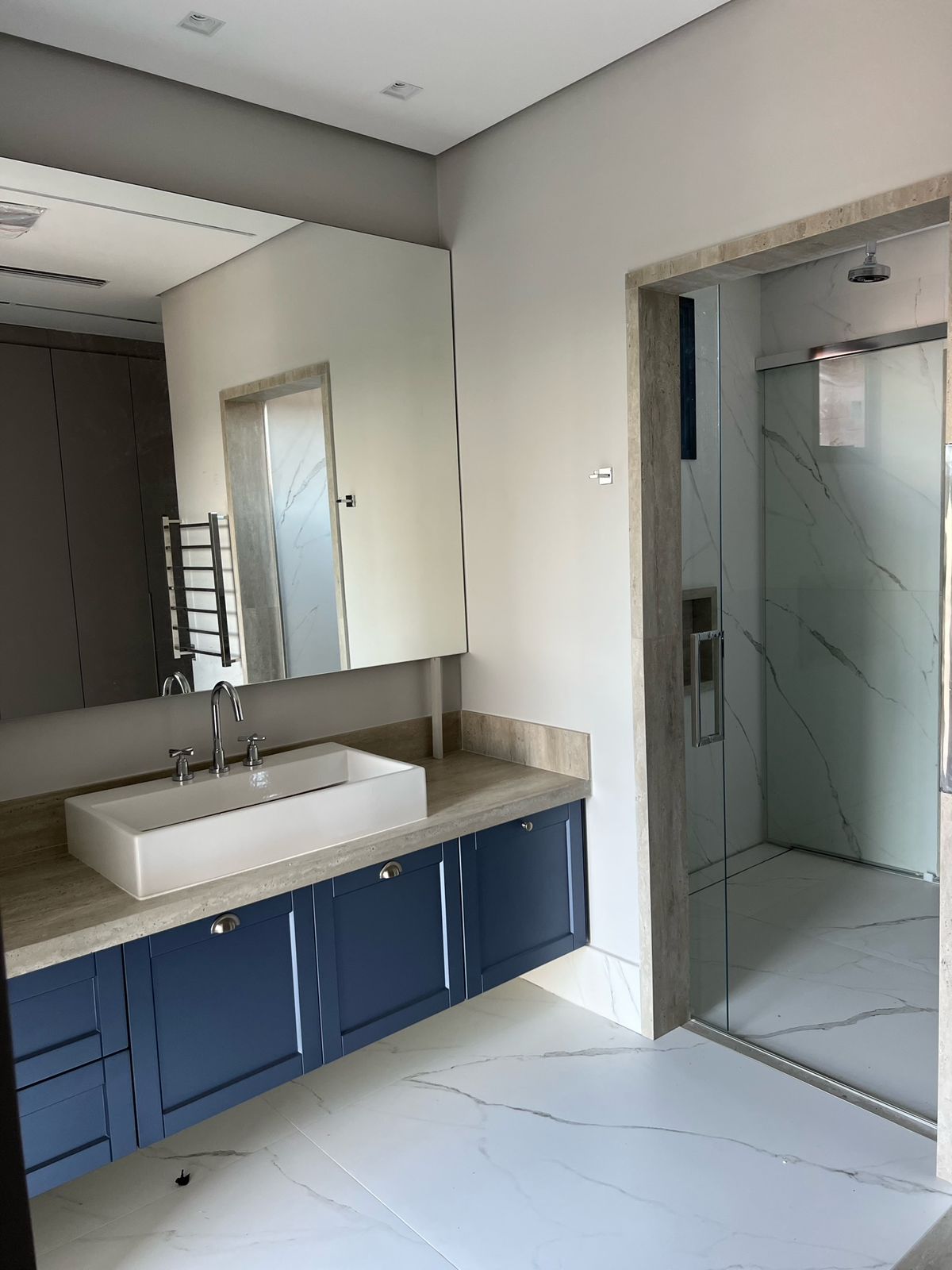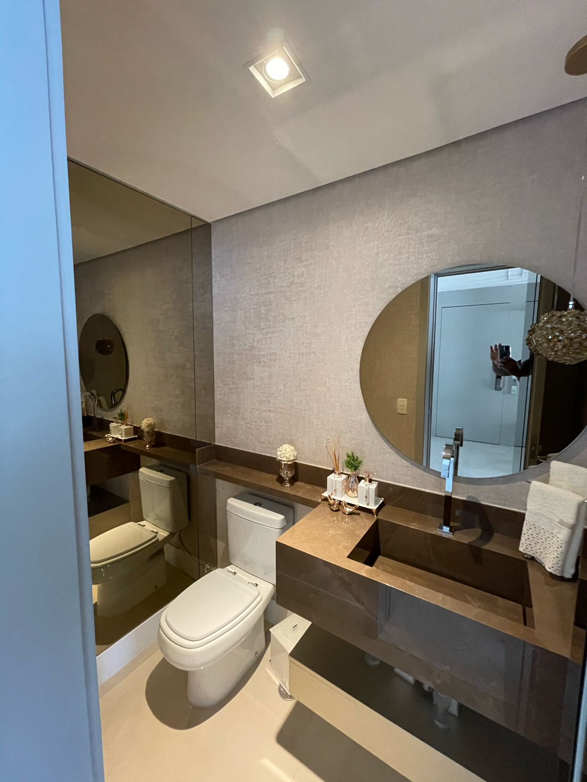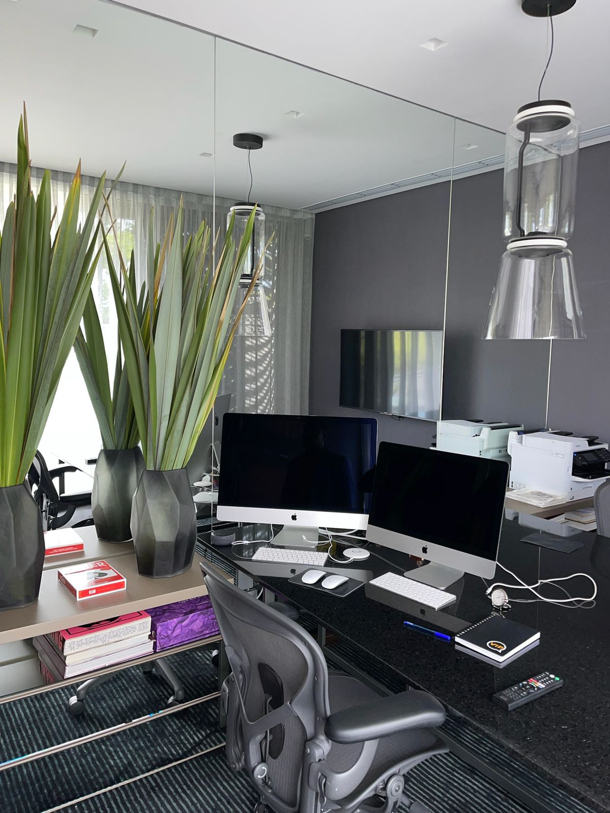Os espelhos refletem a área projetada, dando sensação de amplitude e modernidade.
