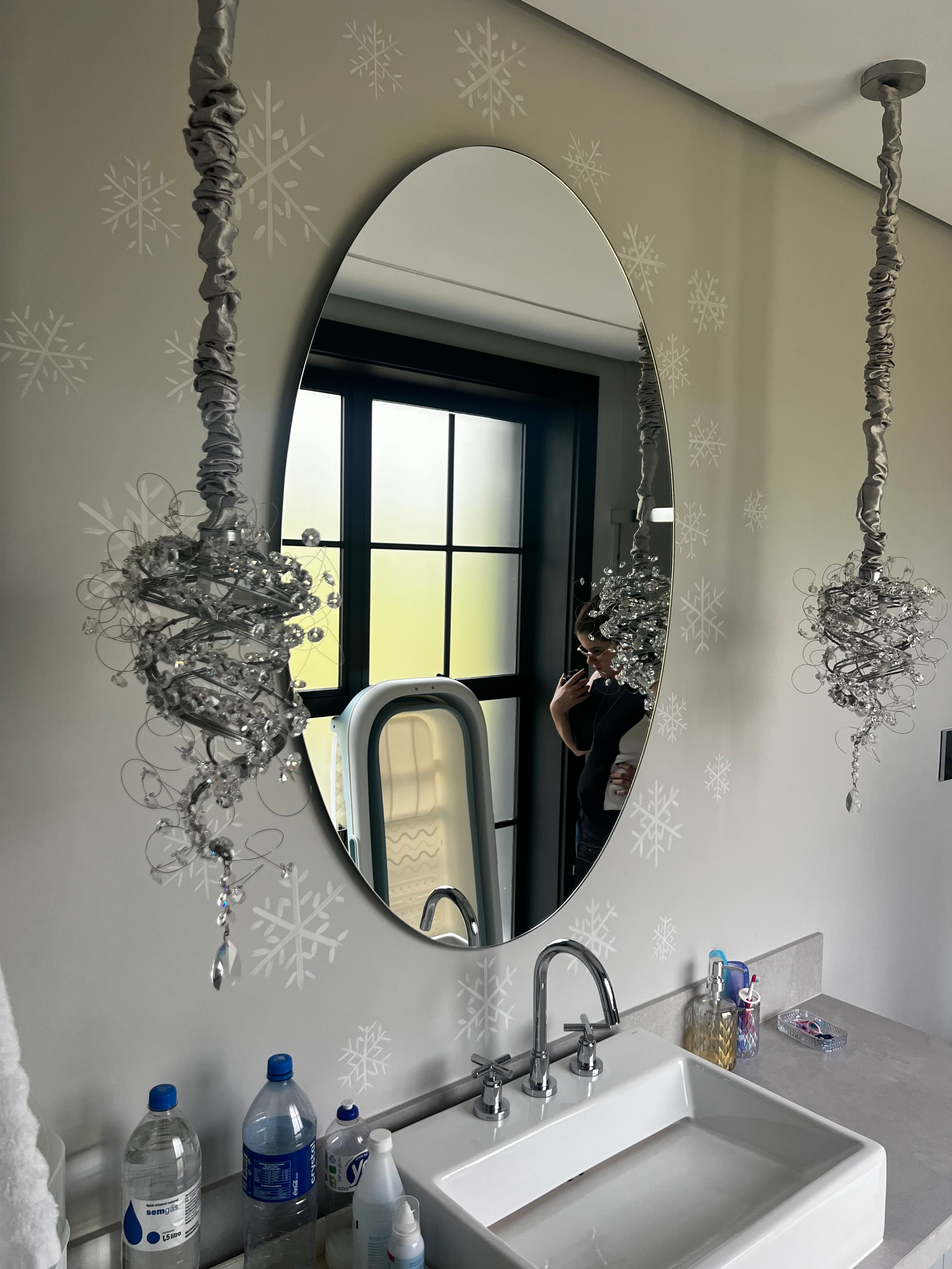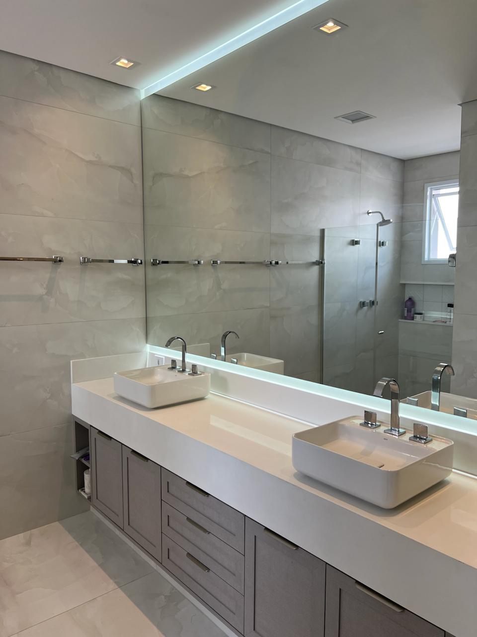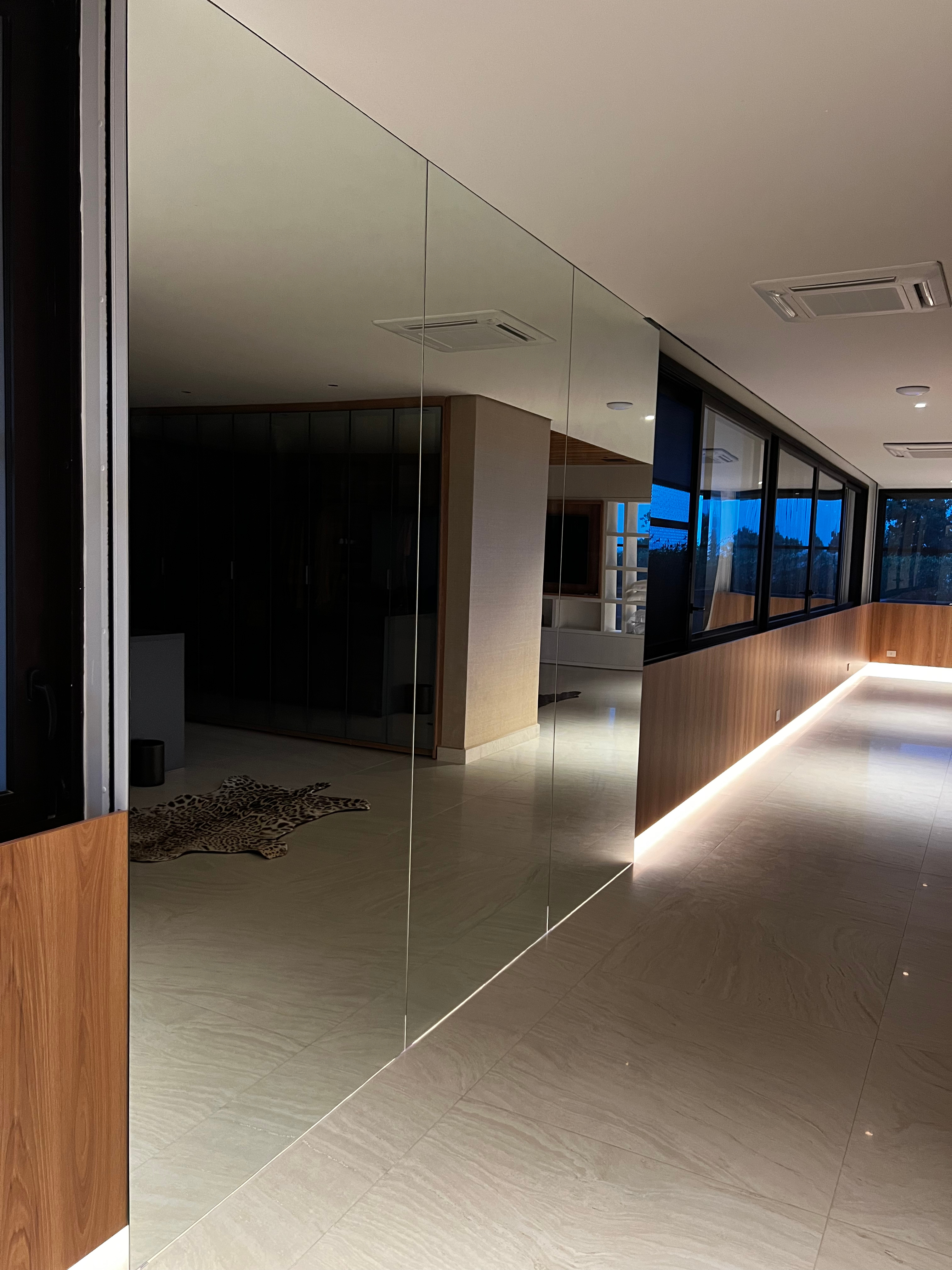 O espelho pode ser inteiriço, cortado na horizontal, vertical, instalado em módulos ou conforme o cliente desejar.