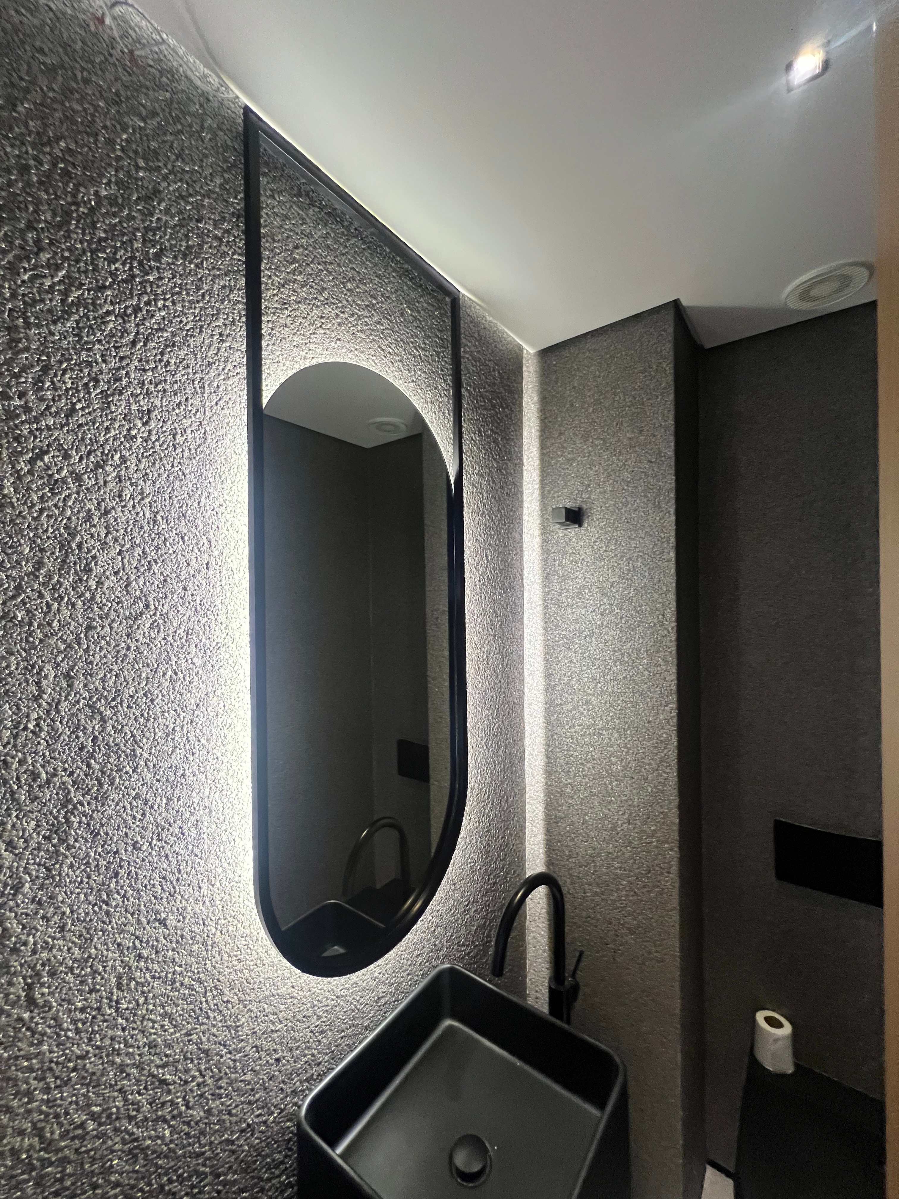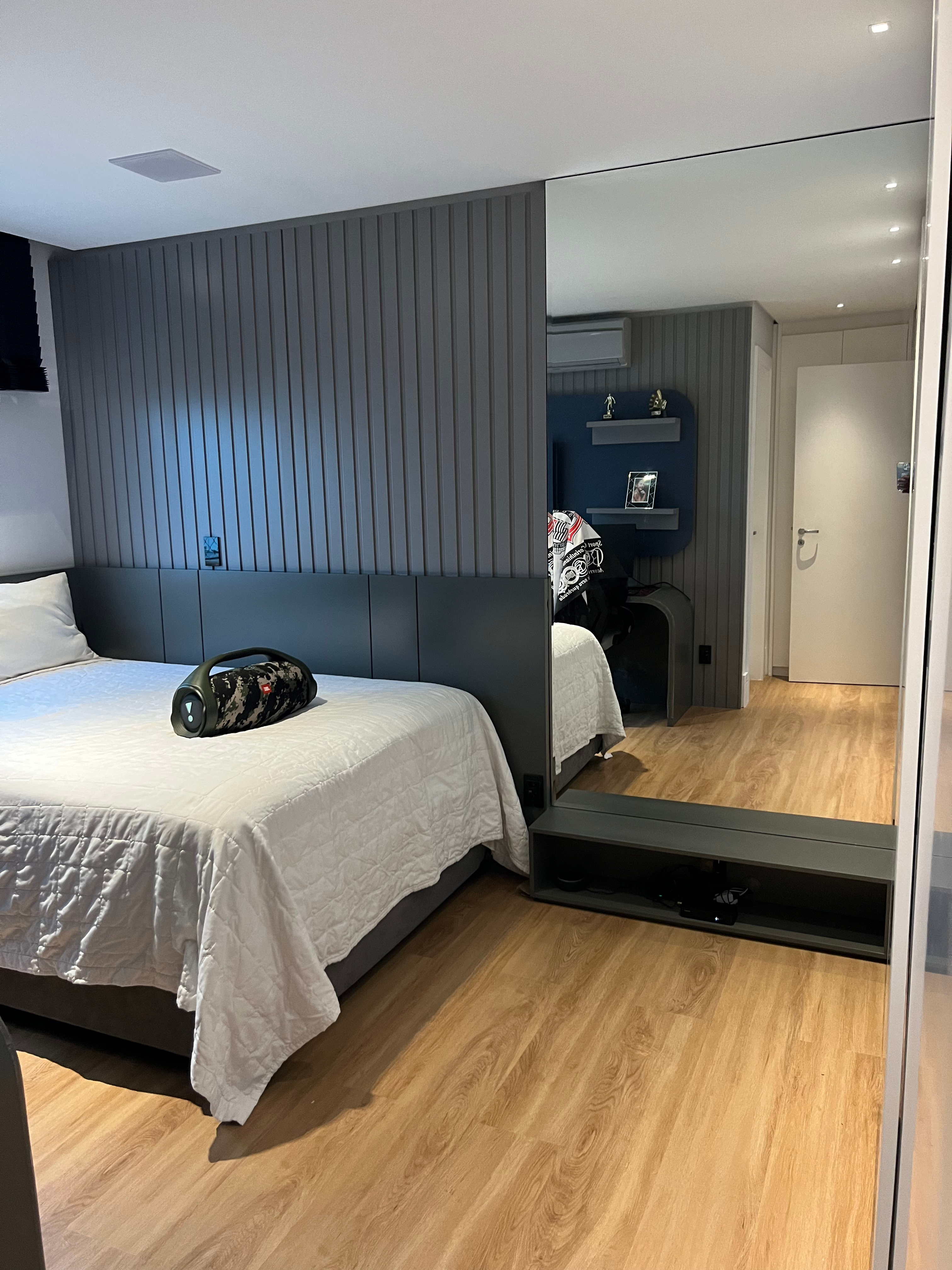 Os espelhos refletem a área projetada, dando sensação de amplitude e modernidade.